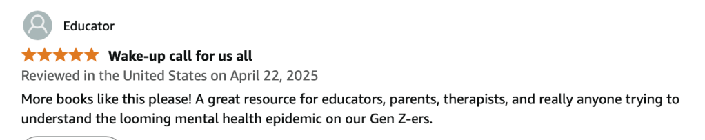 “More books like this please! A great resource for educators, parents, therapists, and really anyone trying to understand the looming mental health epidemic on our Gen Z-ers.”